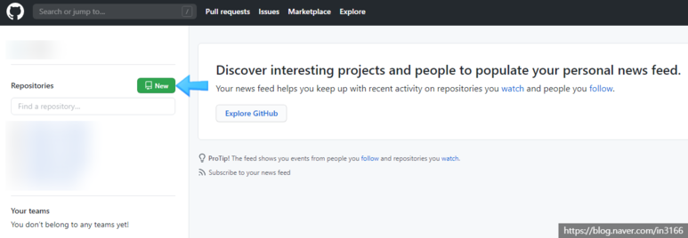 New 버튼을 클릭하여 새로운 Repositorie를 만들어 줍니다.
