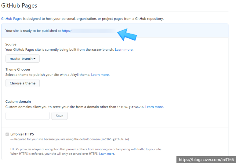 하단으로 조금 내리면 Github Pages가 보입니다. Source 아래의 None을 master branch로 바꿔줍니다.